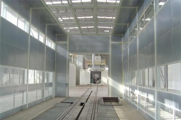 水旋噴漆室由室體、電動門、漆霧過濾裝置、空調送風裝置和排風裝置組成;照明裝置安裝在室體內兩側,照度在500 Lux以上,可分組控制;室內設可燃氣體濃度檢測、報警裝置,漆霧過濾裝置由洗滌板、液力旋壓器、地下水槽和排氣裝置組成。漆霧去除率> 98%;空調送風裝置是使氣體形成層流狀的主要部件,送入供氣室的空氣經過過濾,加熱后,均勻地由給氣頂棚送向室內,使室內風速均勻,無工件時垂直風速可達0 .35~0.4 m?s - 1 ;排風裝置是用風機將室體內的含漆霧氣體經液力旋壓管過濾,從水槽與洗滌板之間排出。